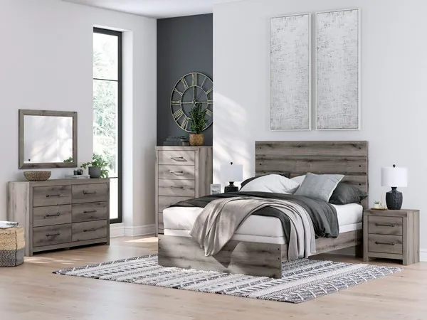 Combining a casual aesthetic with functional flair, this full panel bed suits styles from rustic to industrial. The headboard's slatted panel design has an easygoing character that's sure to please. Dressed in a chic weathered gray hue, it brings a charmingly curated vibe to bedtime.