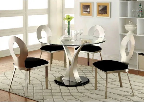 Bold and beautiful, this contemporary set features a round glass table top supported by a flaring V-shaped base. Relax in style as the padded microfiber cushions offer comfort while satin plated powder coating charmingly finishes the metal frames.