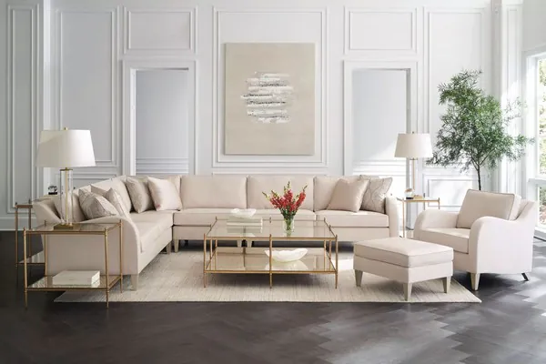 A fresh, yet familiar addition to living room interiors, this Victoria collection sofa adds a note of effortless glamour in a cream performance basket weave with a subtle luster. Gently sloping arms lend a contemporary take on the classic English arm, complemented by tapered legs in a Sparkling Argent finish. Accent pillows add shimmer and tactile appeal in a botanical leaf print and gold toned satin. Sectional and chair also available.