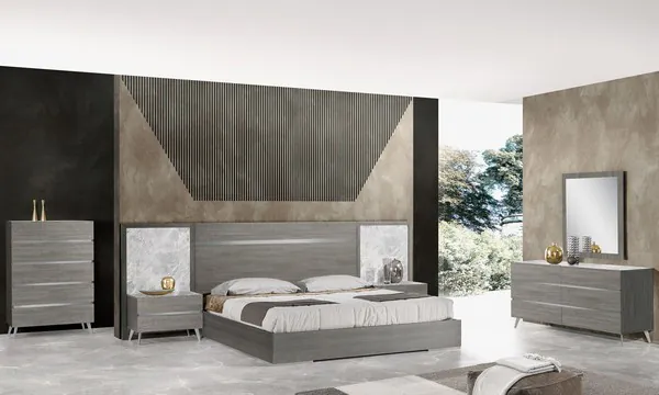 The Victoria Bedroom collection is the newest and most exciting addition to the JNM bedroom lineup. The Victoria Bedroom is made in Italy with the finest materials. The bed and case goods feature a light grey oak veneer, accented by brushed nickel accents. The sides of the headboard feature a light grey marble look, which flows down upon the tops of the accompanying nightstands. The matching dresser and chest tops also feature this same light grey marble look. This seamless combination of finishes creates a perfect collection of furniture meant to turn any home into a luxury venue.