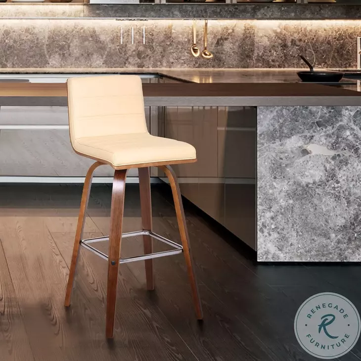 The Vienna 26" Swivel Cream Faux Leather and Walnut Wood Counter Stool by Armen Living provides both versatile style and comfort with a Mid-Century Modern design that can easily be integrated into your home's current décor. The 360-degree swivel function provides optimal mobility so you and your guests to stay engaged regardless of your placed in the room at parties and gatherings. The Vienna’s frame is constructed of strong wood that is brilliantly accented by the plush high-density foam cushion that’s wrapped in faux leather upholstery. A square metal footrest is added for a chic and stylish aesthetic without comprising practicality and functionality of this item. The soft faux leather upholstery makes clean up a breeze, making this the perfect bar or counter stool for any entertaining home! With multiple bar seat height options and the armless design, you can easily pull the Vienna up to your kitchen island, peninsula counter, or home bar. The high seat back ergonomic properties to keep your back healthy and properly aligned. The Vienna is an ideal addition to any home or apartment and It's quality materials ensure a comfortable seat for many years to come. The Vienna Counter or Bar Stool is available in 26” or 30” seat height and comes in your choice of a walnut wood finish with cream, grey, or brown faux leather or a black wood finish with grey faux leather.Features
