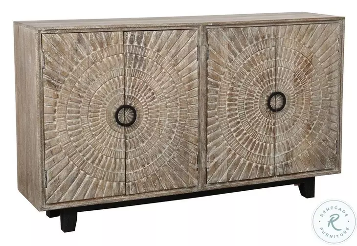 Artisanal from the start the Vivienne Sideboard features solid hand carved mango wood arranged in a starburst pattern across its two doors. Removable shelves add to the piece's utility and versatility.Features