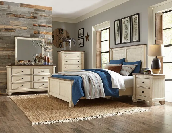 Transitional rustic styling is expertly achieved in the design of the Weaver Collection. Antique white provides bold contrast to the brown-gray plank-style tops, with pine solids and oak veneer further lending visual texture to the bedroom. Classic framing paired with dark metal knob hardware complete the rustic look.
