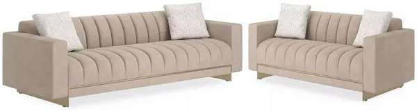 The Well-Balanced Sofa was inspired by Italian design and offers beautifully tailored channel tufting in a luxurious basketweave fabric in a shimmering Moonstone hue. This stylish vogue detailing and cosmopolitan silhouette makes this sofa the perfect focal point to build a spectacular room around in whichever chic city you’re in across the globe. A tailored, thin gold detail is incorporated into the sofa frame. Its squared arms are the perfect height for resting or reading. Suspended off the ground by a continuous Whisper of Gold framework, this sofa appears to be lighter than air. This sofa’s sophisticated lines look beautiful when floating in an interior.