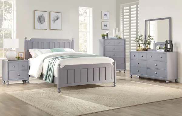 The modern farm house serves as inspiration for the design of the Wellsummer Collection. Offered in white or gray finish for complete decorative versatility in your bedroom, this fresh look will satisfy your love of country styling. Ball finials top the bed posts while turned feet provide support to all pieces in the collection. Wood knob hardware centers the drawer fronts solidifying the trend forward transitional look.