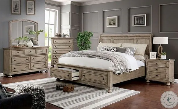 Bring tranquility home with this Willa Collection from Furniture of America. The bed features a sleigh back paneled headboard and two large footboard storage drawers. Hidden night stand and dresser drawers and a USB outlet in the night stand. With a Gray finish and classic bun feet this look makes for one elegant collection.