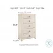 Two-tone finish in white wash replicated worn through paint with authentic touch and a replicated wood grained block pattern with authentic touch. Large scaled shapely bedroom set features bun feet. Ring pull hardware in an antique brass color accented with white paint hang up. Dressing chest with a slider door reveals open storage with two adjustable shelves and five drawers. Side roller glides for smooth operating drawers.Features