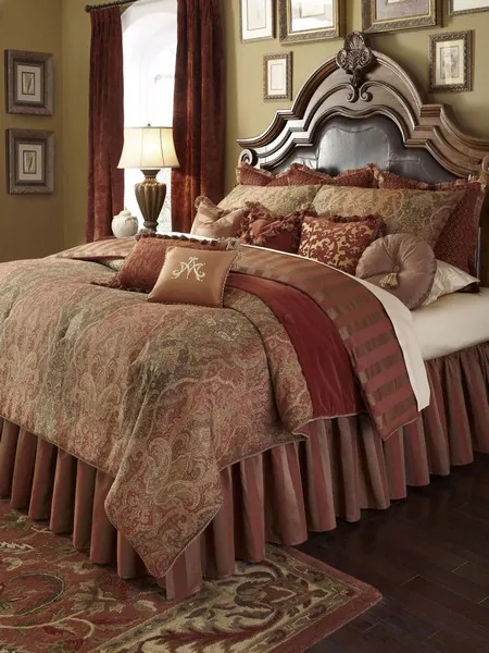 The Woodside Park Comforter Set by Michael Amini features a beautiful paisley mixed with velvet that embodies all that you love about the English country manor style. The oversized stripe on the adjustable bedskirt, with a 21 inches drop, and comforter reverse, add a bit of whimsy. The chenille jacquard euros shams have brush fringe accent trim. We have spared no expense on the details. Included are 6 decorative pillows, one a jaguar chenille, and of course the Michael Amini signature pillow. Enhance any bedroom with this traditional ensemble.