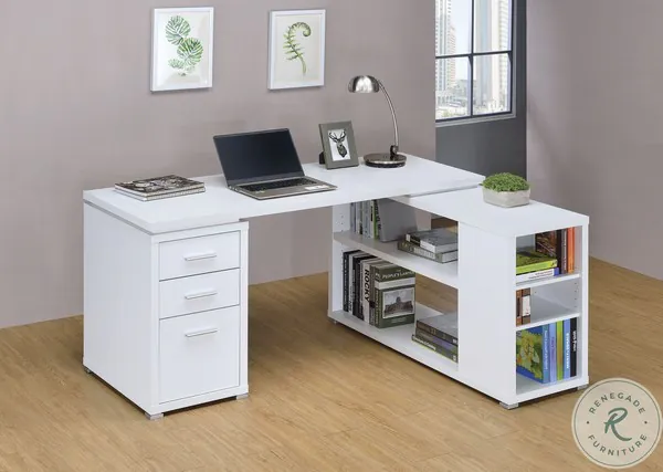 This collection of reversible L-shape desks can be adjusted for personal preference. This desk has plenty of storage space in open shelves and drawers with a bottom file cabinet. Available in three finishes with silver hardware: white, cappuccino, and weathered grey.