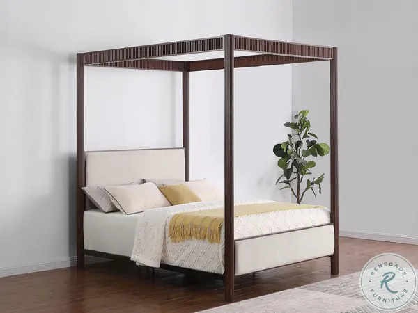 Transform your bedroom with this modern canopy bed that combines industrial strength with elegant design. Constructed entirely from sturdy metal, the frame is finished in a rich rust brown that highlights Its contemporary appeal. Upholstered panels on the headboard and footboard are wrapped in soft beige fabric, providing a comfortable contrast to the robust frame. The vertical grooves along the posts add a textured touch, while the open canopy design creates an airy and spacious feel. This bed offers the perfect balance of durability and style, making it an ideal centerpiece for any modern bedroom.
