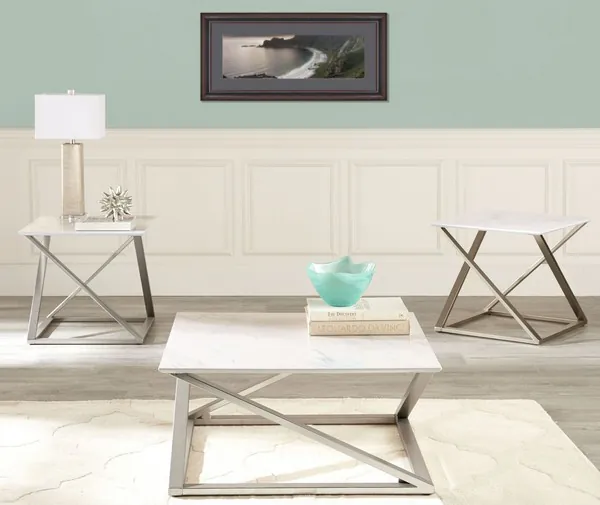 A mixed media table collection with a clean contemporary style, Zurich features a knife edge faux marble top with an asymmetrical metal base that is as visually alluring and adds interest to any room. Matching end tables complete a collection that will brighten any room.